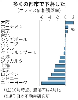 日本のオフィスやマンションに世界の不動産投資マネーが集まっている。民間調査によると、10月時点でのオフィス価格の上昇率は大阪が世界の主要15都市で最も大きかった。東京も3番目に大きい。緩和的な金融政策や安定した賃貸需要が投資家をひき付ける。金融引き締めで売買が低調だった米ニューヨークや英ロンドンなどと明暗が分かれた。