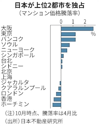 海外の投資マネーは日本のマンションにも触手を伸ばす。10月のマンション価格は大阪が4月比2.7%高と首位だった。2位の東京は1.2%高と前回調査(4位)から順位を上げ、上位2都市を独占した。